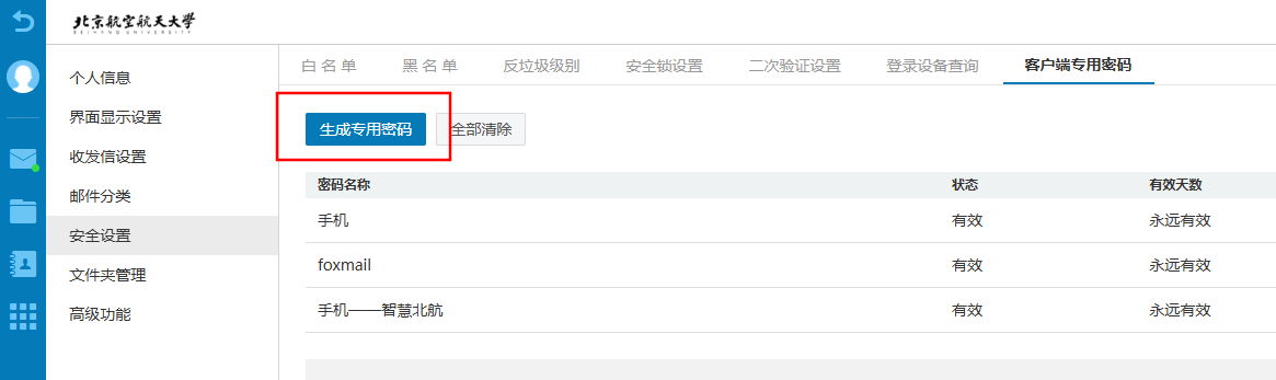 1.获取专用密码:登录网页版邮箱(https://mail-443.e2.buaa.edu.cn),点击页面左下角的“设置”图标(齿轮形状),依次选择:安全设置→客户端专用密码,点击“生成专用密码”按钮,在弹出的“密码名称”文本框中输入设备备注名(如“我的手机”),生成后点击随机字符右侧的“复制”按钮提取密码明文(注:该明文仅显示一次);