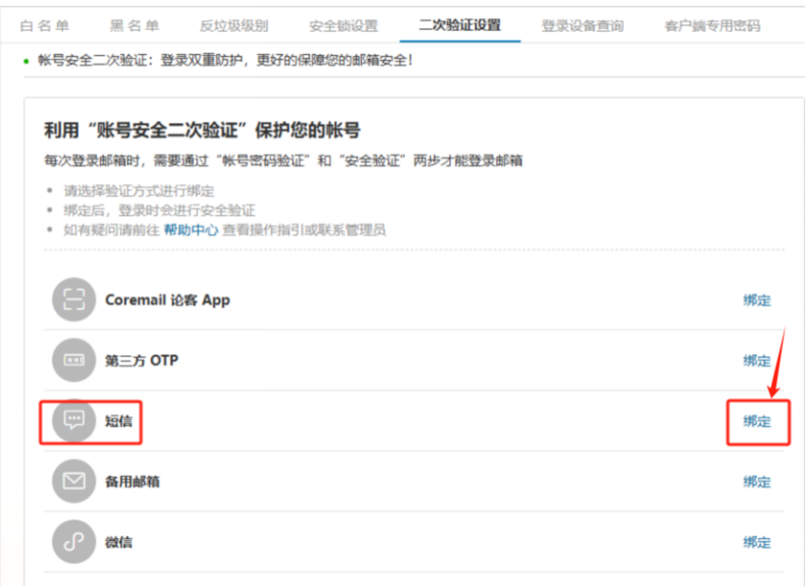 2.核对与绑定手机号:检查“短信”栏显示的手机号状态,若已显示正确号码,则系统已自动绑定成功,直接跳过本步。若未显示号码,点击右侧“绑定”按钮按提示完成验证。若显示的号码错误,请致电010-82317005申请后台解绑后重新绑定。