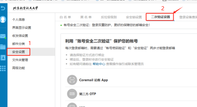 1.进入配置页面:登录网页版邮箱(https://mail-443.e2.buaa.edu.cn),点击页面左下角的“设置”图标(齿轮形状),依次选择:安全设置→二次验证设置;